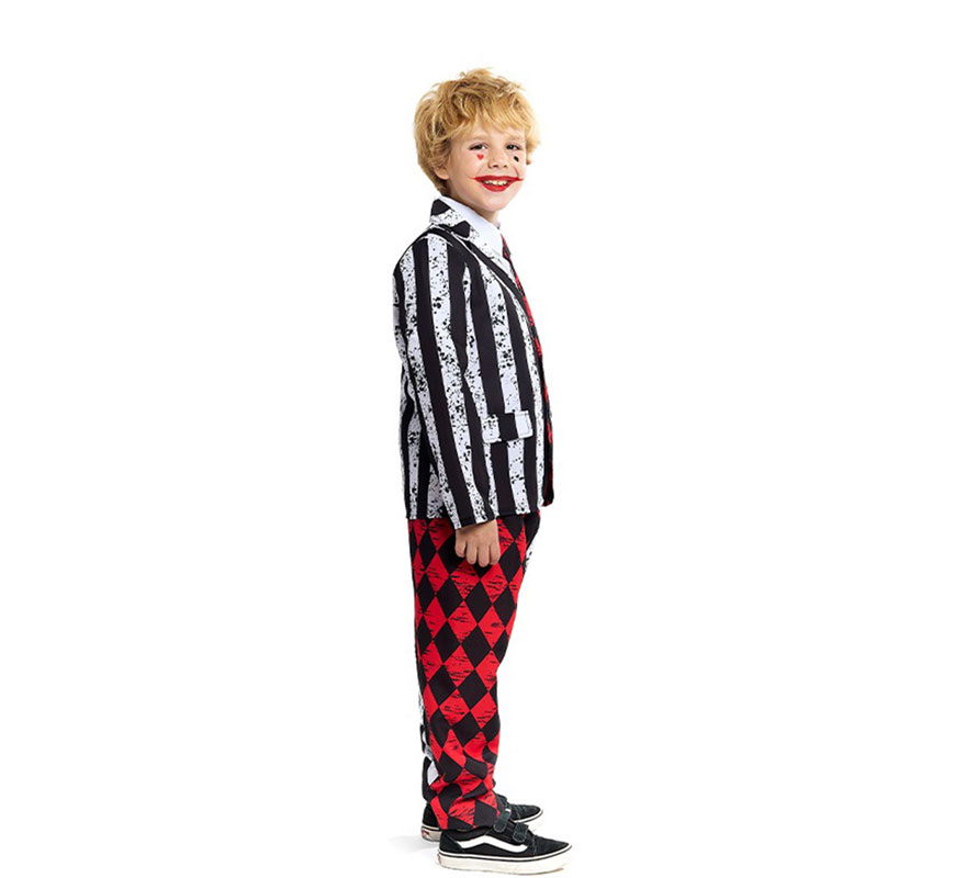 Disfraz de Bufón Siniestro a Rayas y Rombos para niño. Incluye Chaqueta, Pantalón, Corbata. No incluye resto de accesorios mostrados en las imágenes.
