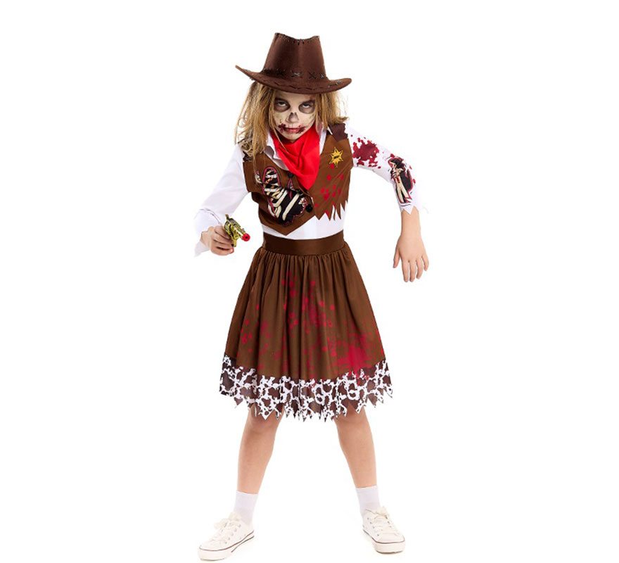 Disfraz de Vaquera Zombie para niña. Incluye Camisa, Falda, Pañuelo. No incluye resto de accesorios mostrados en las imágenes.